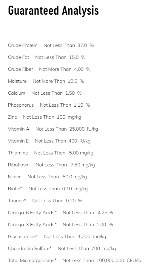Deboned Turkey, Turkey Meal (source of Glucosamine), Chicken Meal (source of Chondroitin Sulfate), Lentils, Peas, Dried Ground Potatoes, Chicken Fat (preserved with Mixed Tocopherols), Tomato Pomace, Ground Flaxseed, Turkey Liver, Turkey Hearts, Natural Chicken Flavor, Salmon Oil, Taurine, Choline Chloride, Vitamin E Supplement, Spinach, Broccoli, Carrots, Parsley, Apples, Blueberries, Kale, Spearmint, Zinc Proteinate, Mixed Tocopherols added to preserve freshness, Zinc Sulfate, Calcium Carbonate, Niacin, Iron Proteinate, Ferrous Sulfate, Vitamin A Supplement, Copper Sulfate, Thiamine Mononitrate, Copper Proteinate, Manganese Proteinate, Manganese Sulfate, d-Calcium Pantothenate, Sodium Selenite, Pyridoxine Hydrochloride, Riboflavin, Biotin, Vitamin D3 Supplement, Chicory Root Extract, Yucca Schidigera Extract, Calcium Iodate, Vitamin B12 Supplement, Folic Acid, Ascorbic Acid (Vitamin C), Dried Lactobacillus plantarum Fermentation Product, Dried Enterococcus faecium Fermentation Product, Dried Lactobacillus casei Fermentation Product, Dried Lactobacillus acidophilus Fermentation Product, Rosemary Extract, Green Tea Extract, Spearmint Extract.
